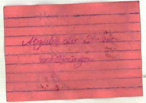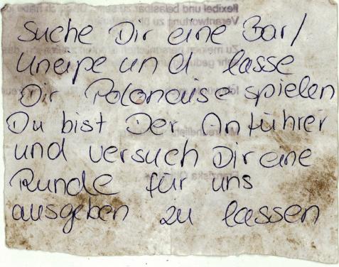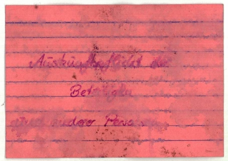 Sicher sind Sie neugierig geworden, welche Informationen ungeachtel halbiert in der Gegend liegen. Um uns herum schlummern Nachrichten oder drängen sich unangenehm in unsere Wahrnehmung. Hier sollte ich differenzieren: ich betrachte keine Plakate, Werbung ohnehin nicht, nicht die Zeitungen, nicht das Fernsehen. Diese Informationen sind überall für jeden erreichbar. Hans Wurst aus H. und Christiane F. aus B. sehen zeitgleich die Nachrichten, lesen die SMS auf Viva, ob in Großräschen, Treuenbritzen oder Schabeutz. Nein, ich rede von den wirklich Einmaligen, Einzigen: wie bemalte Plakate. Oder dem älteren Herrn, der in der U-Bahn einen Stoß beschriebener Zettel memoriert. Wahrscheinlich um sie sorgsam zu verteilen. Ich bin dem nachgegangen und fand diese Karteikarten.