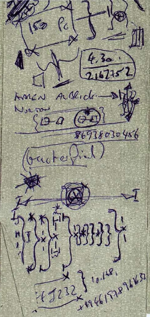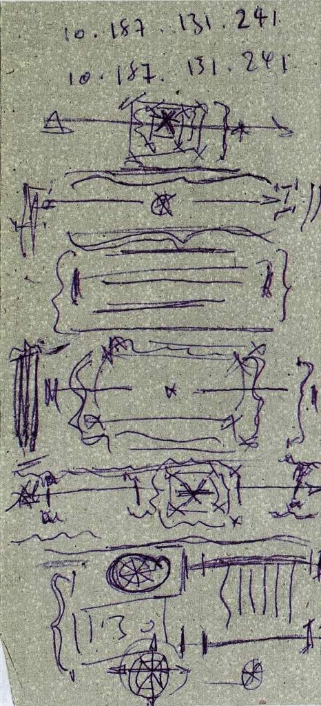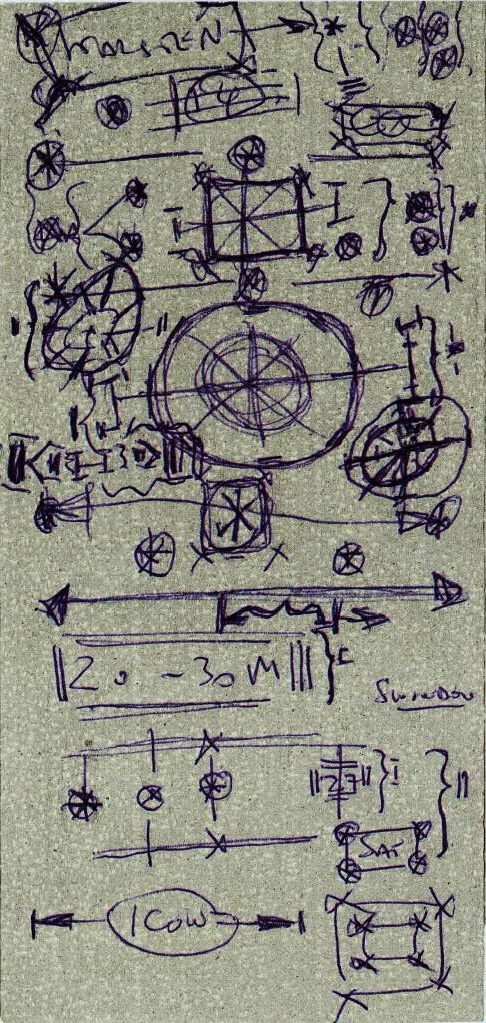 Auch an Notizen denke ich. Nur scheinbar Kritzeleien, angefertigt während Telefonaten oder Sinnespausen. Aber eben einzigartig in der Ausführung und dem Inhalt nach. Da finden wir Papierhandtücher mit für uns verworrenen Konstruktionszeichnungen, Lageplänen, Berechnungen ! Die vorliegenden Papiere wurden von ein und derselben Person angefertigt zu unterschiedlichen Zeiten und Anlässen. Ich versuche, das zu deuten - oberflächlich, denn die Vielfalt der Symbole und Zeichen will ich nicht alleinstehend sehen. Hierzu bedarf es weiterer Funde.