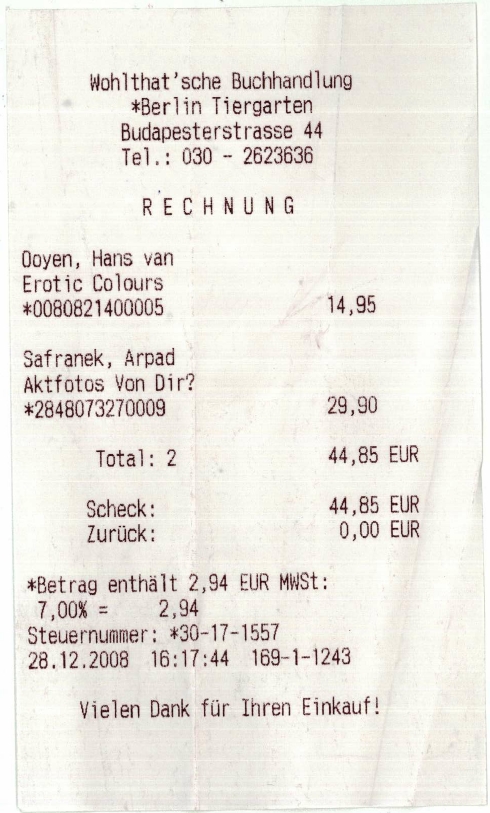Noch ist mir die Bedeutung nicht klar, aber es war Absicht, dass ich den Schein in die Hand bekam. Sie wussten, in welchem Laden ich regelmäßig mit einem kleinen Betrag einkaufen würde. Und nun sollte ich eingeschüchtert werden: Ich bekam eine Rechnung in einem Buchladen, auf der ein Buch vermerkt war mit dem Titel Aktfotos von Dir ? Offensichtlich eine Verwechslung, denn ich hatte eine wissenschaftliche Abhandlung von Steven Hawkings über Strings und schwarze Löcher sowie Tom Saywer von Euro Twain erstanden. Noch kamen keine Erpressungsforderungen, aber Rechnungsbelege müssen mindestens zehn Jahre aufgehoben werden.