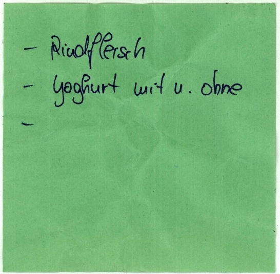 Nicht zufällig ist das Wort Joghurt mit Y.. geschrieben worden und nicht Jogurt oder Joghurt - nein : Yoghurt. Bleibt noch die Erweiterung des Joghurts: mit u. ohne, was sich durch geschickte Buchstabenvertauschung als Name herausstellt : Timo Hune. Er stammt folglich von den Hunen ab. Das passt wiederum mit der osteuropäischen Schreibung Yoghurt zusammen. Rätsel gibt allein der dritte Bindestrich ohne Text auf. Ist er o.B.: ohne Bedeutung, offenbar belanglos, ohne Bindung ? War der Eintrag so geheim, das ihn der Verfasser selbst nicht kennen durfte ? Oder ist der Schreiber dieser Zeilen kurz vor dem Diktat getötet worden ?